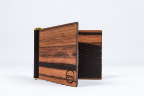 Our stylish wallets are made by hand. For this we use different types of wood and leather. Inside the wallet there are, in addition to the clip, two card holders for 2-4 cards each. The wooden wallets are elastic and therefore you won’t feel them in everyday life.
